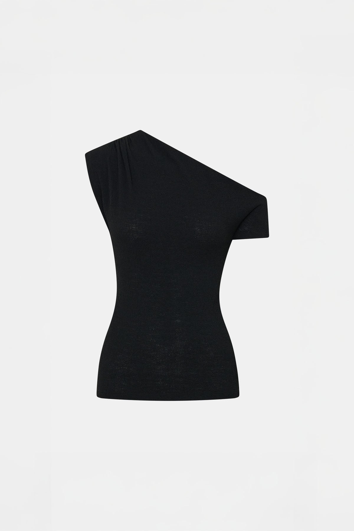 CAMILLA AND MARC Cali black textured crepe off-the-shoulder top with draped asymmetric neckline. Fitted waist.
